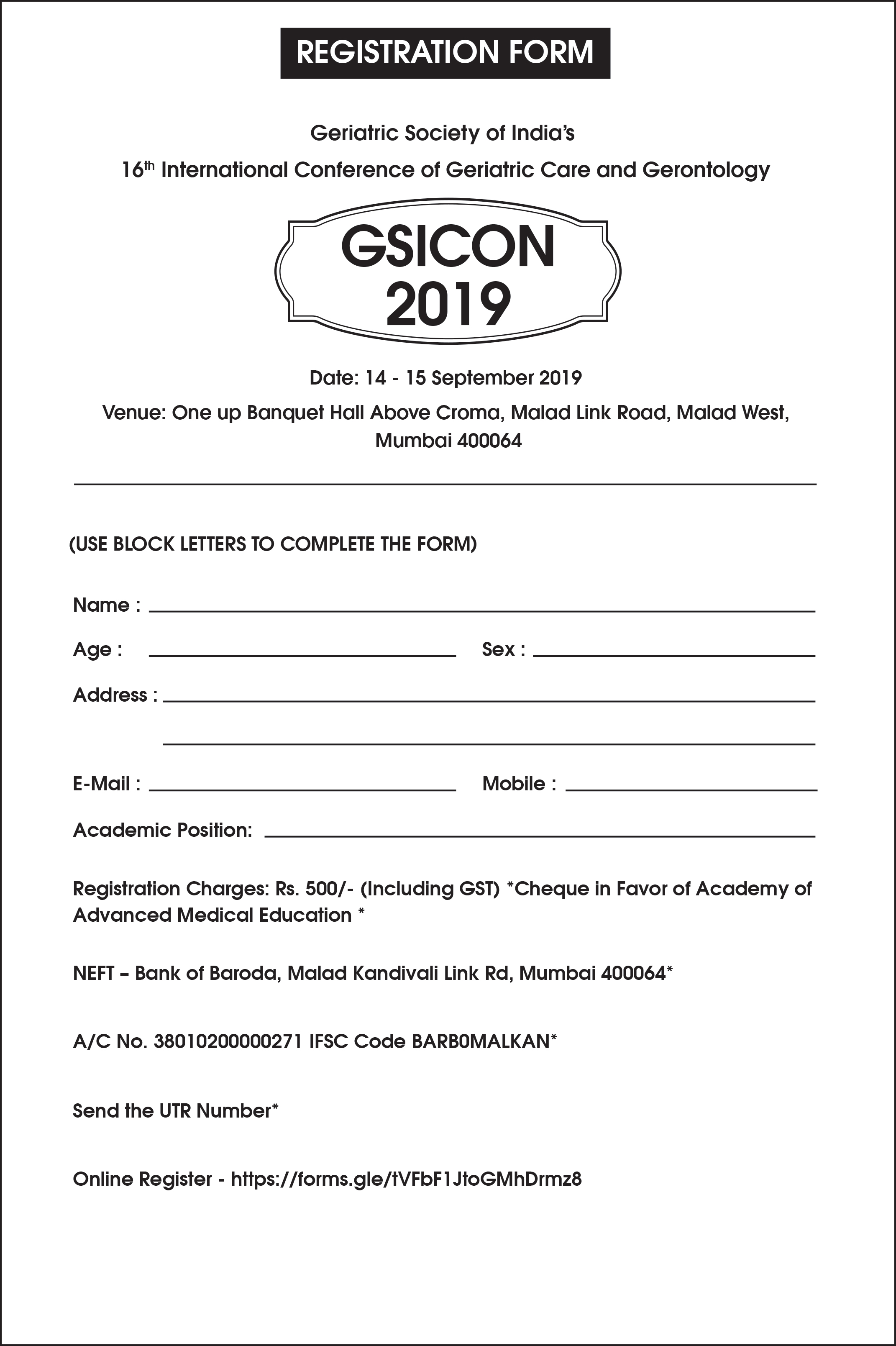 16th International Conference of Geriatric Care and Gerontology - GSICON 2019 September 14-15, 2019 / Mumbai Brochure / Registartion Form / Message from GS / Schedule
